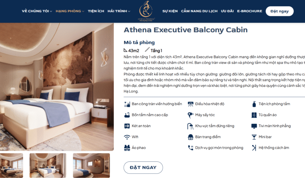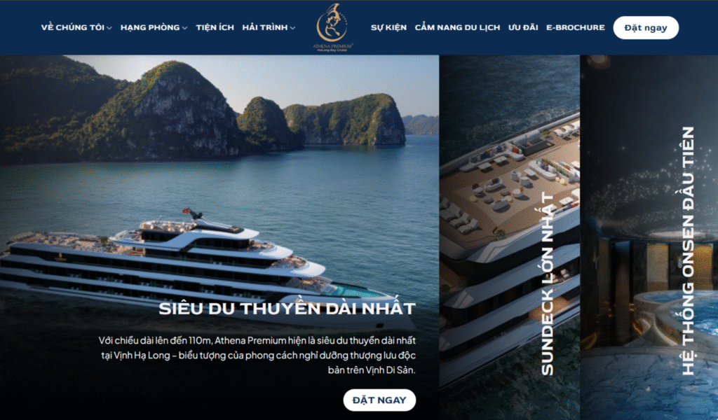 • Khẳng định uy tín trong lĩnh vực du thuyền nghỉ dưỡng cao cấp: Website thể hiện vị thế của Athena Premium Cruise là thương hiệu du thuyền 5 sao hàng đầu tại Vịnh Hạ Long – Lan Hạ, mang đến hành trình nghỉ dưỡng sang trọng, an toàn và đáng nhớ cho du khách.