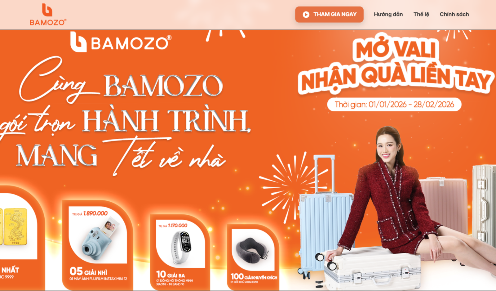 Bamozo là thương hiệu vali và phụ kiện du lịch, mang đến các sản phẩm bền bỉ, hiện đại và tiện dụng cho người dùng. Website được thiết kế dưới dạng landing page minigame nổi bật với tông cam chủ đạo, cung cấp đầy đủ thông tin về chương trình “Mở vali – Nhận quà liền tay”, bao gồm thể lệ, cơ cấu giải thưởng, hướng dẫn tham gia và form đăng ký tối ưu.