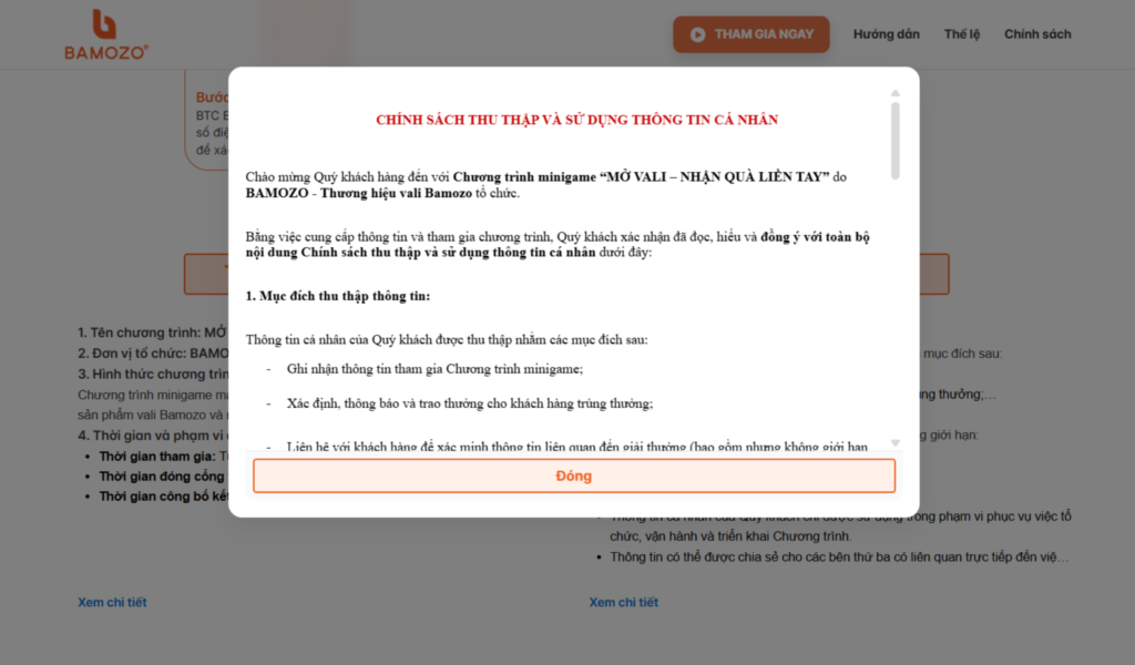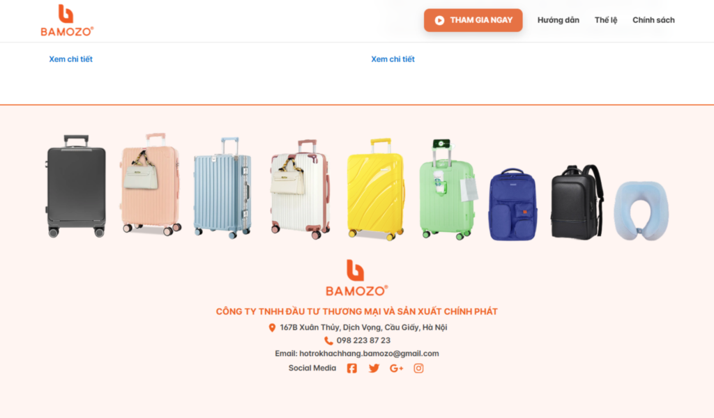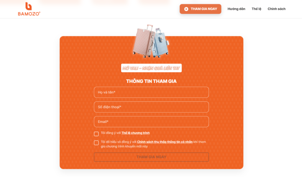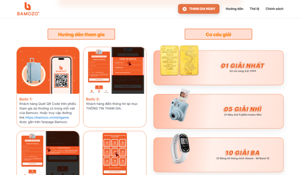 Bamozo là thương hiệu vali và phụ kiện du lịch, mang đến các sản phẩm bền bỉ, hiện đại và tiện dụng cho người dùng. Website được thiết kế dưới dạng landing page minigame nổi bật với tông cam chủ đạo, cung cấp đầy đủ thông tin về chương trình “Mở vali – Nhận quà liền tay”, bao gồm thể lệ, cơ cấu giải thưởng, hướng dẫn tham gia và form đăng ký tối ưu.